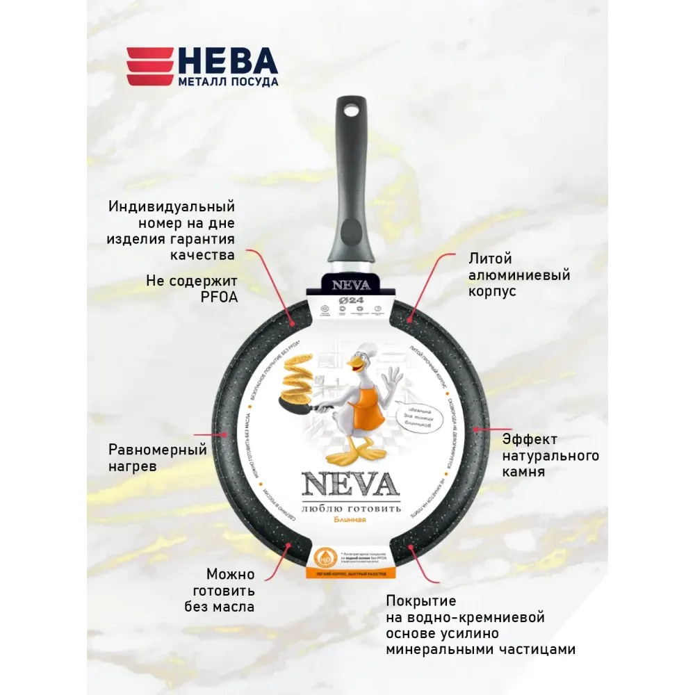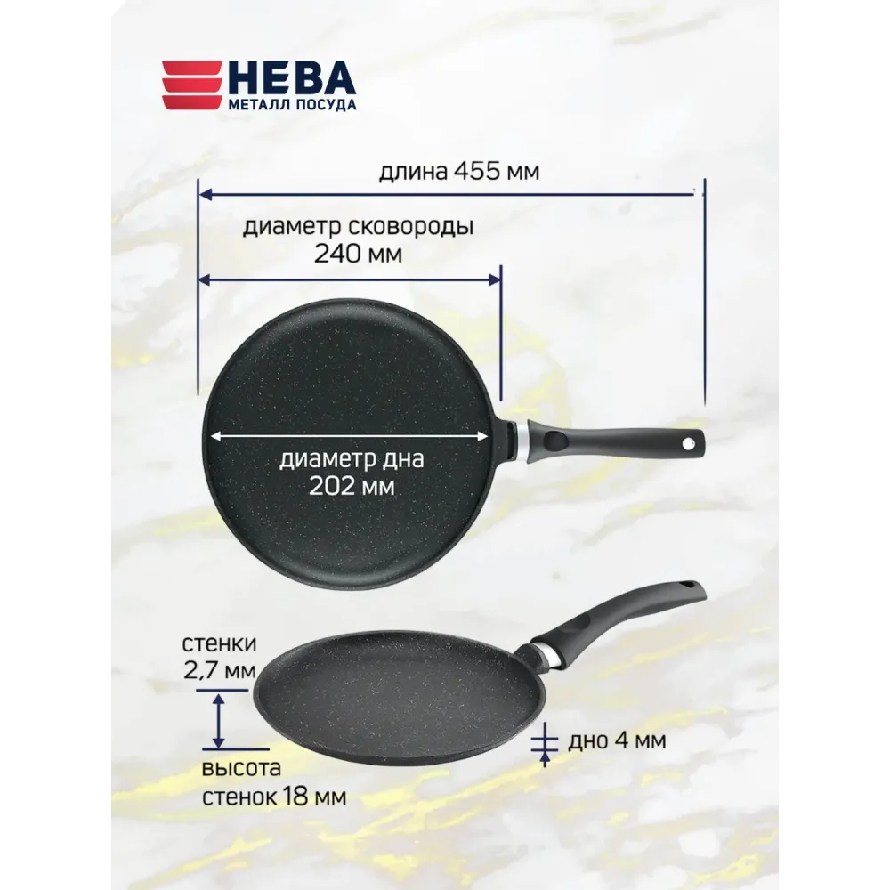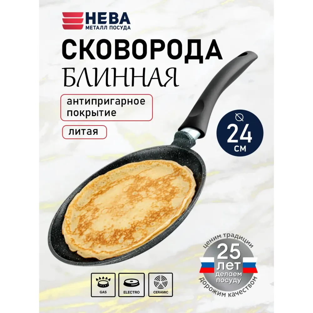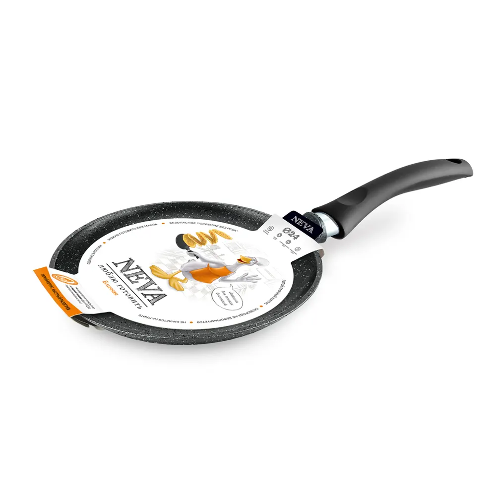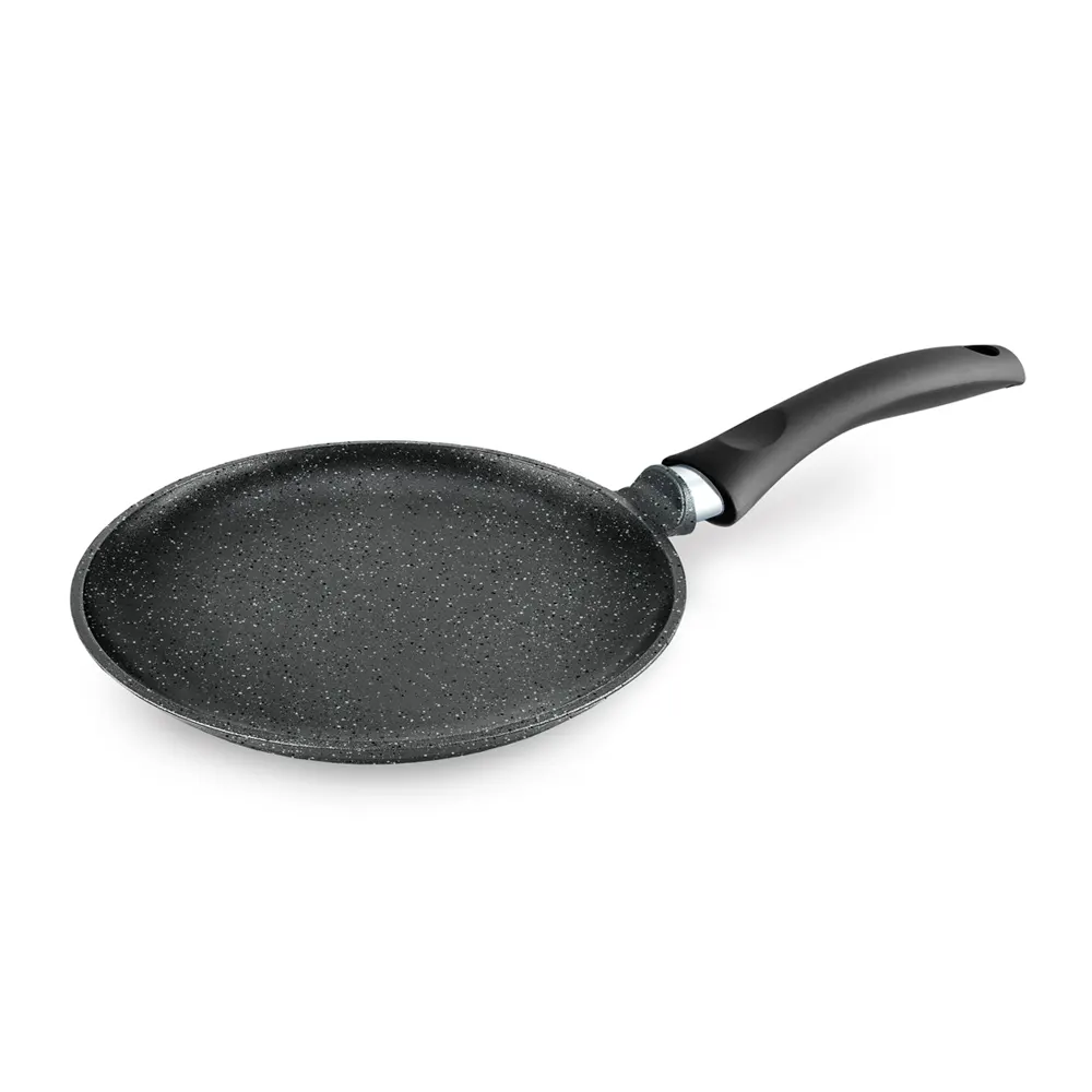 Блинная сковорода имеет низкий борт и удобную ручку, благодаря чему легко переворачивать и снимать блины. Утолщенное дно обеспечивает особые термоаккумулирующие свойства: блин равномерно пропекается по всей толщине и красиво румянится с обеих сторон. Благодаря антипригарному покрытию блины всегда легко снимаются со сковороды и не пригорают, даже при выпекании без использования масла.